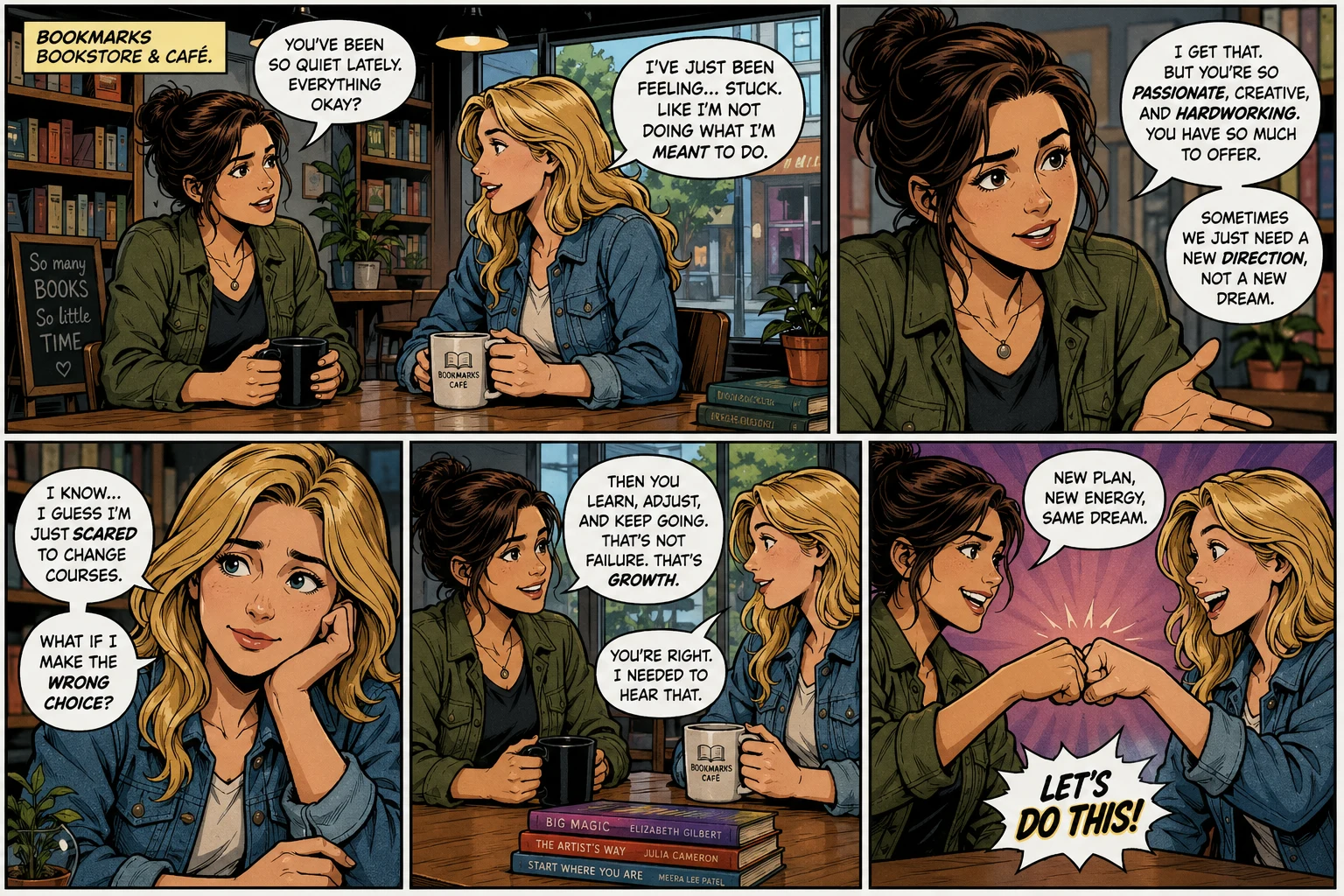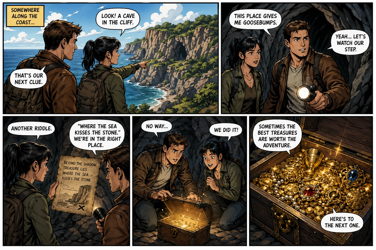 Create your own American comic book-style strip starring yourself, friends, or your pet: saturated newsstand color, thick outlines, halftone shading, and funny-page energy. Optional photo, optional scene note, speech bubbles, landscape or portrait, one multi-panel image.