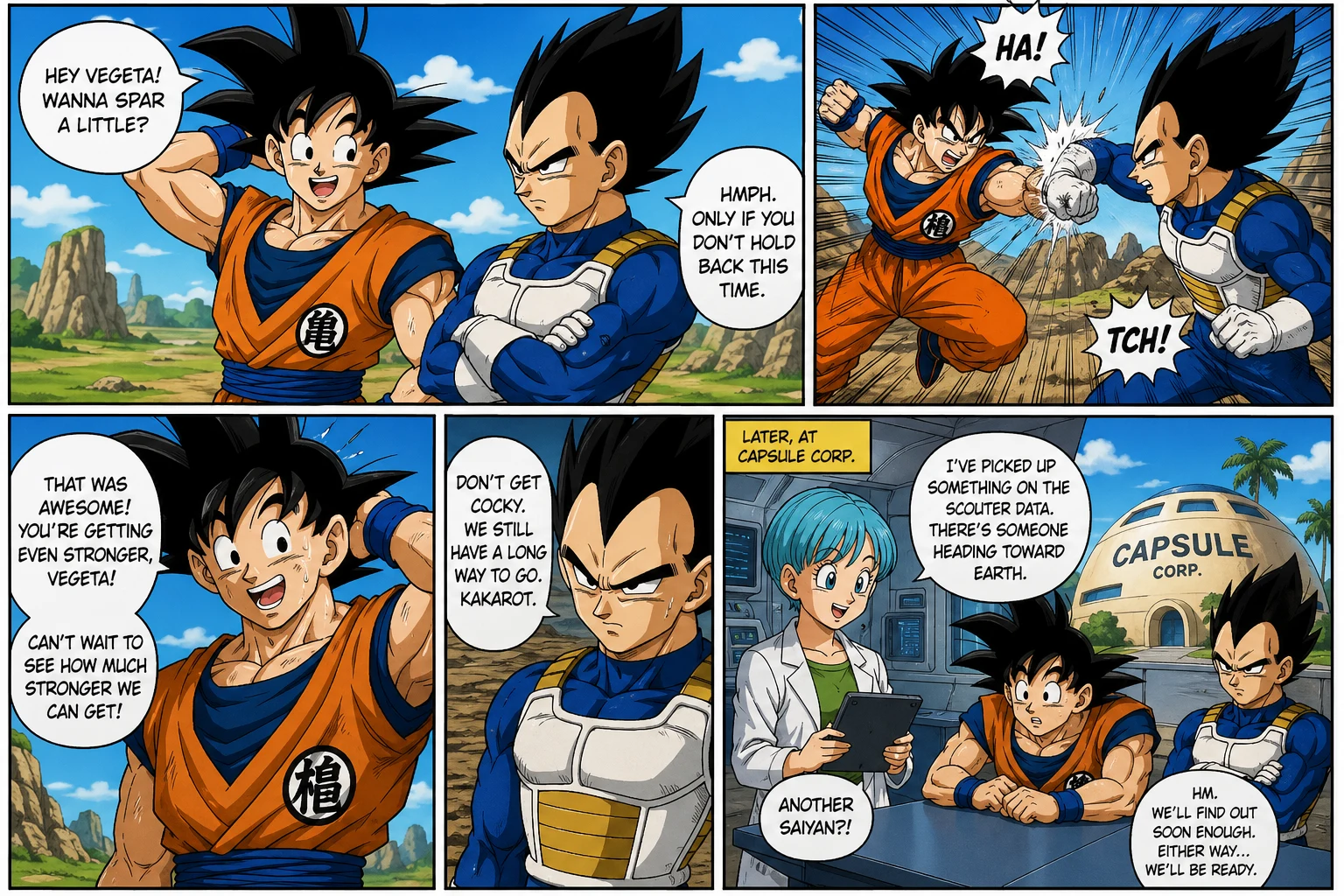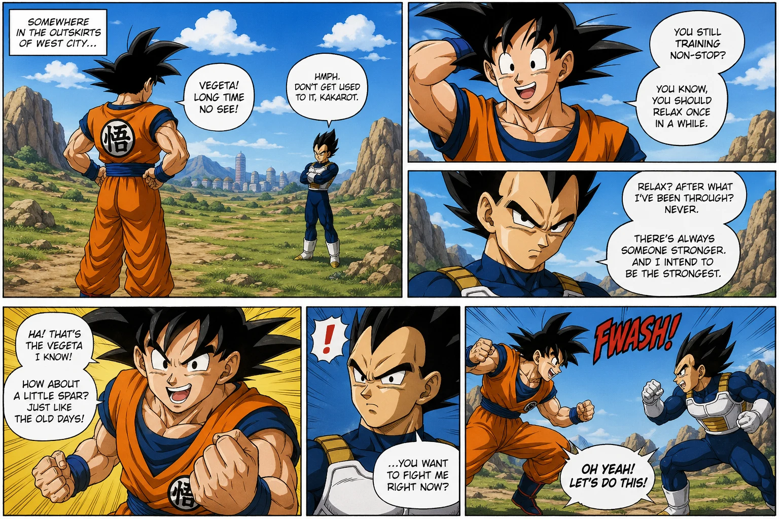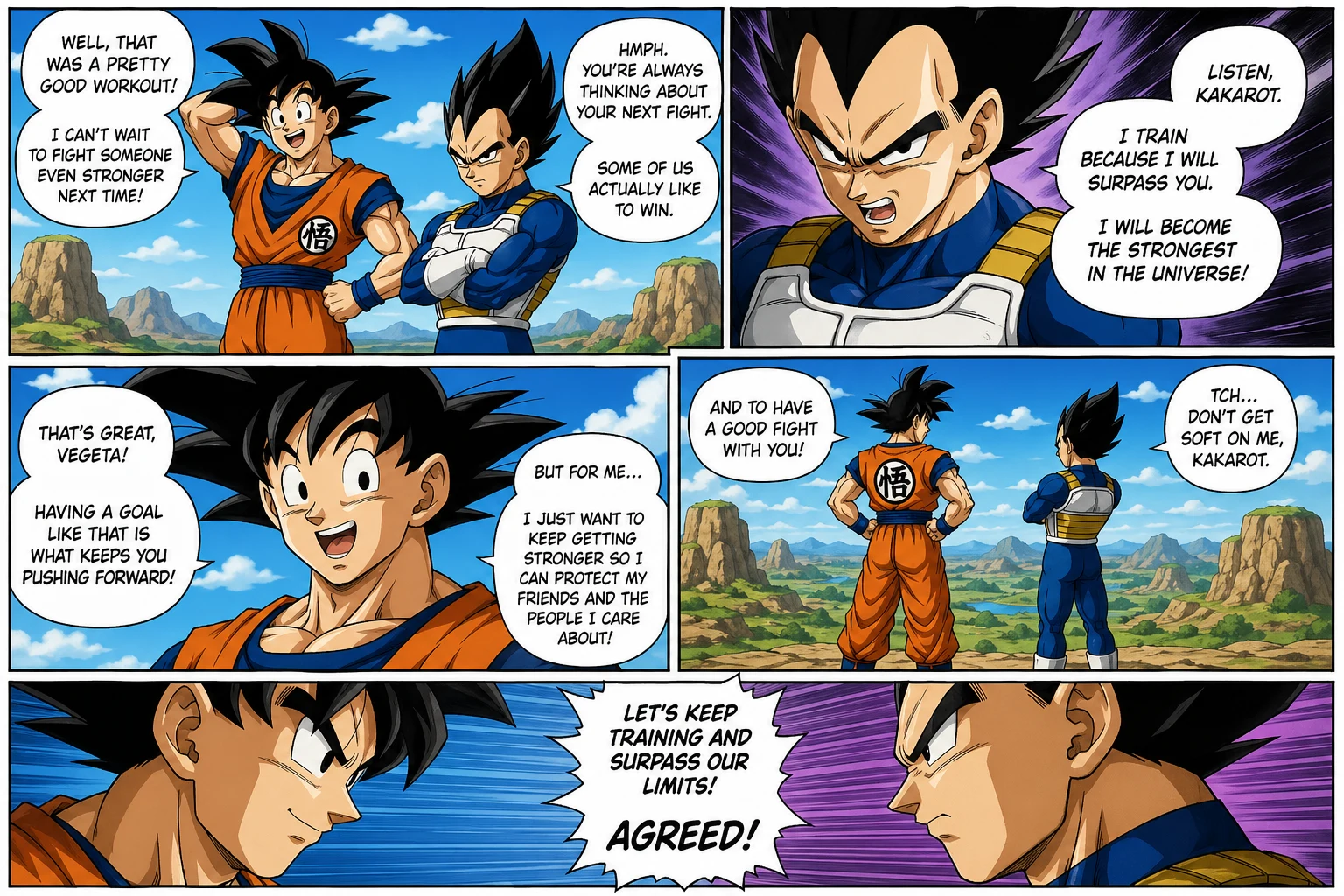 Create your own Dragon Ball-style training comic strip with you, friends, or your pet in the panels: wide open sky, speed lines, dusty sparring-ground humor, and bold shonen poses in speech bubbles. Optional photo, optional story beat, one multi-panel image, landscape or portrait.
