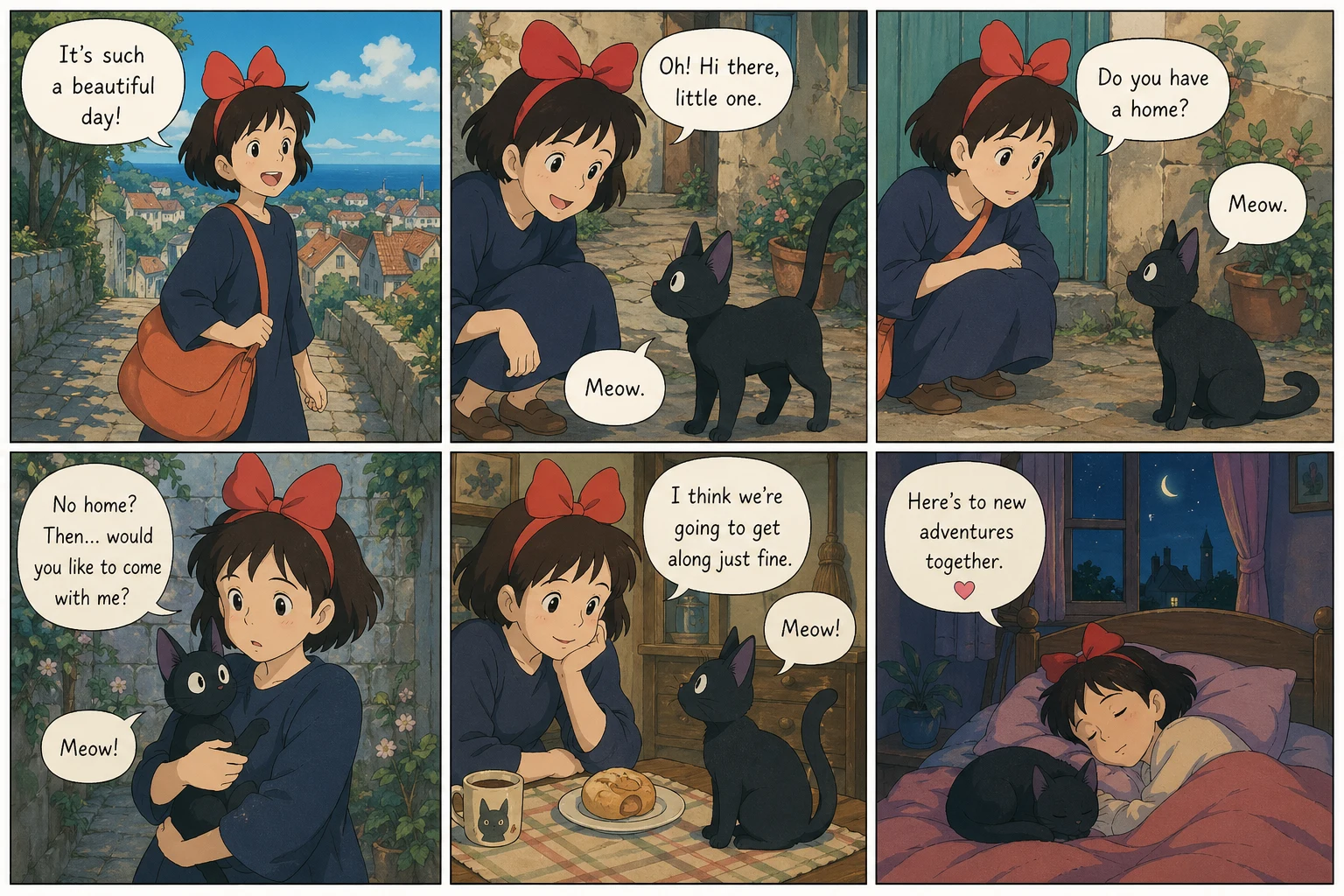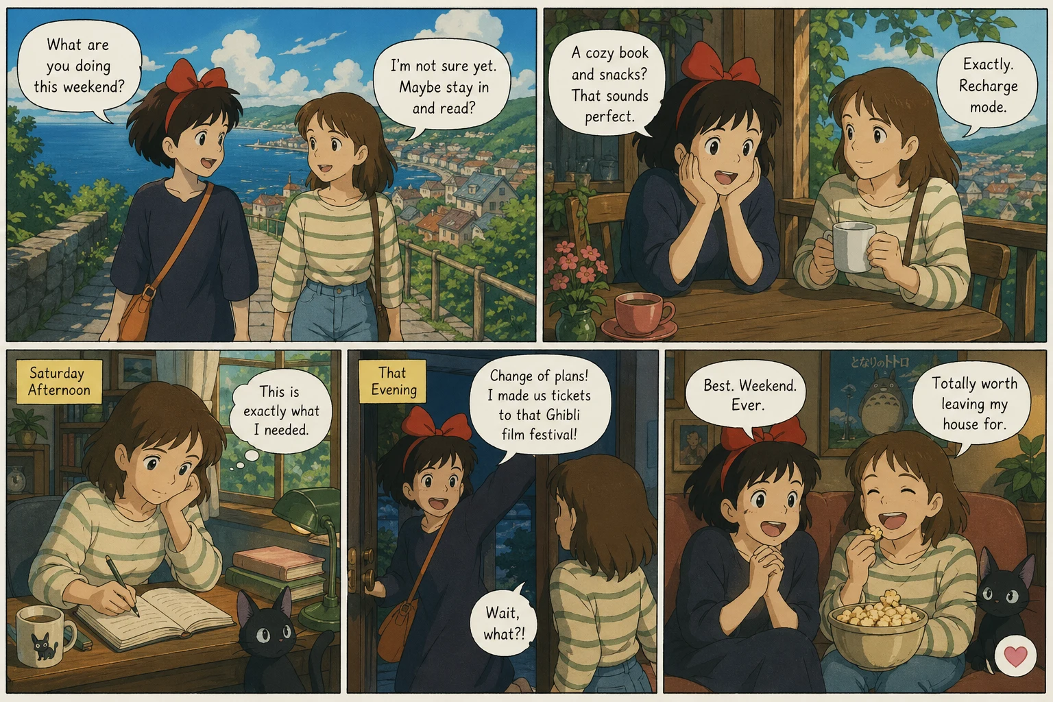 Create your own Studio Ghibli-style comic strip starring yourself, friends, or your pet: soft watercolor-like color, gentle painted backgrounds, and dialogue in speech bubbles. Optional reference photo, optional story note, landscape or portrait layout, one downloadable multi-panel image.