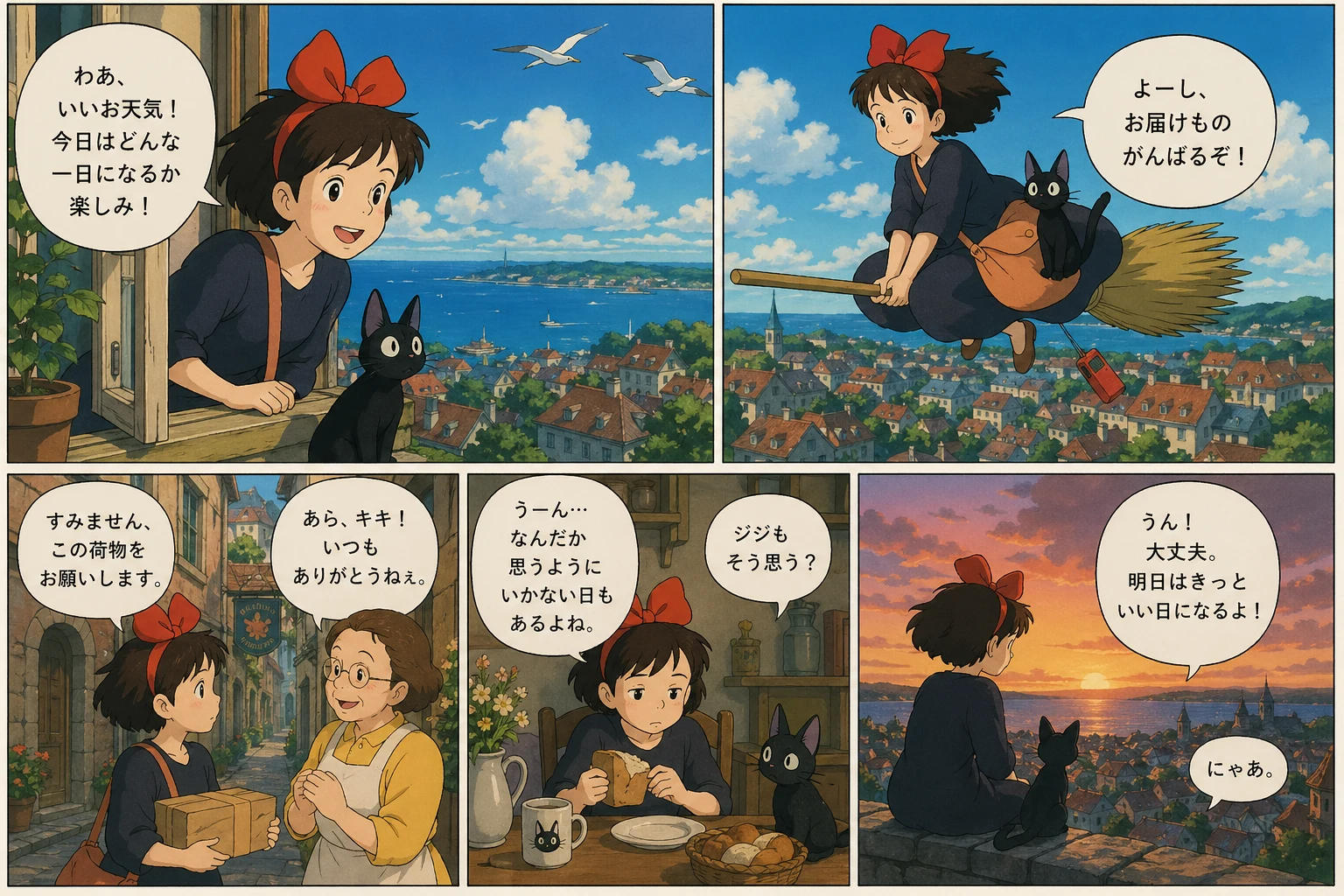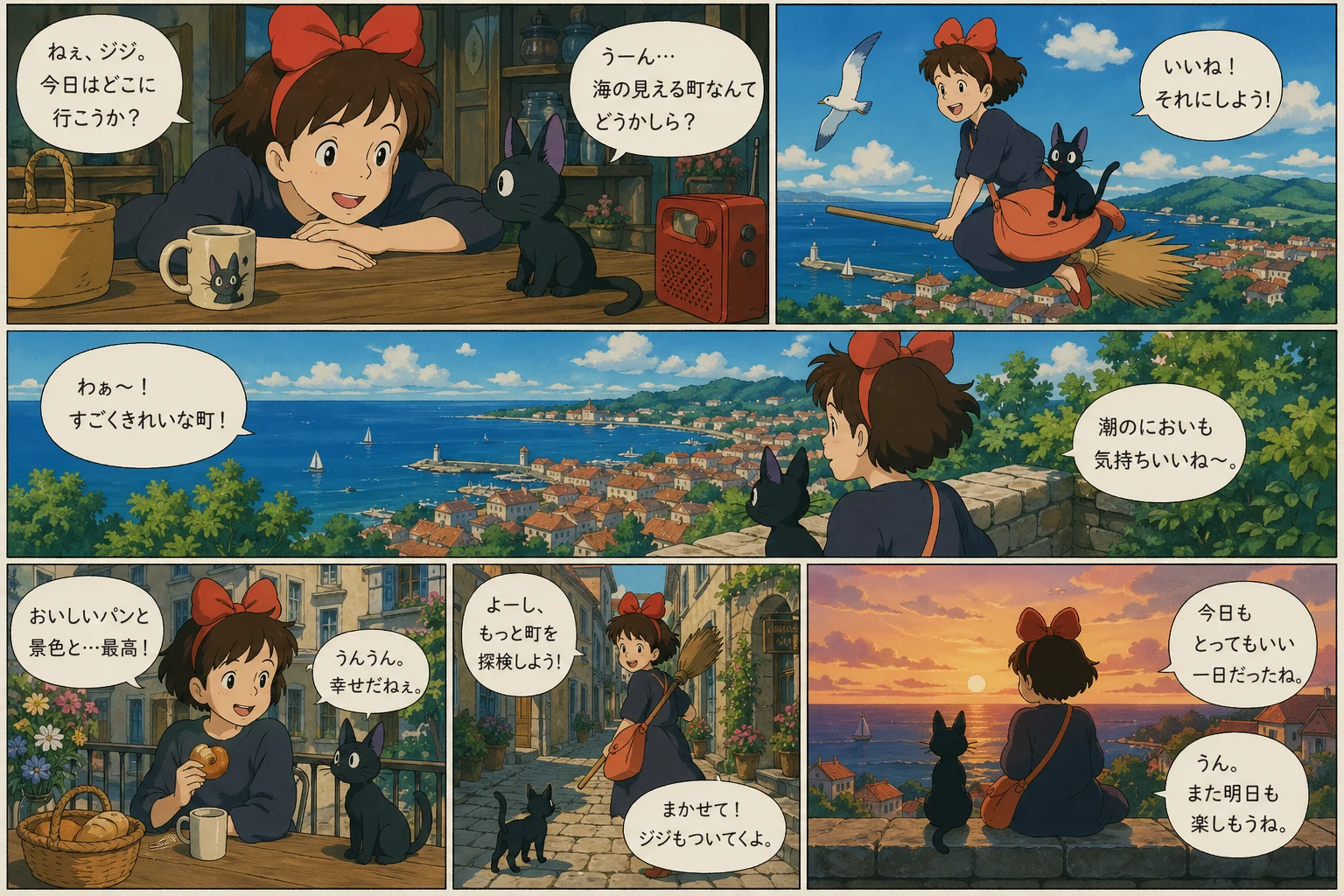 自分・友人・ペットを主役にしたスタジオジブリ風コマ漫画を、吹き出し付きの多コマで1枚にまとめます。やわらかい水彩調の色味、劇場アニメのような背景、セリフ入りのストリップ。写真は任意、短いストーリーメモも任意。横長・縦長を選べ、1枚の画像をダウンロード。