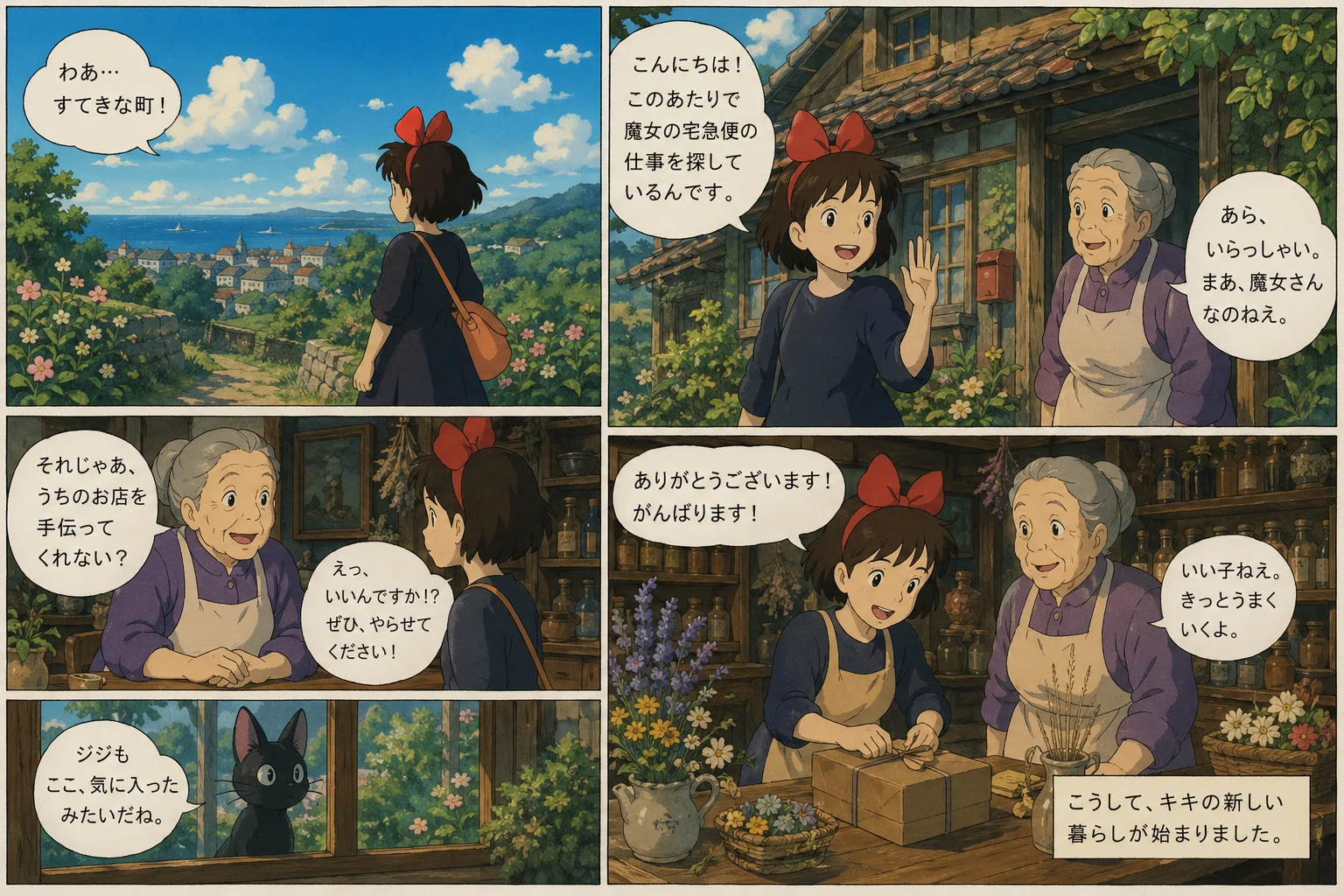 ジブリ風のAIコマ漫画ジェネレーター、やわらかい水彩調のマンガストリップ、自撮りやペットの写真をアニメ風のコマ割りに変えたい、そんな目的に合うツールです。劇場版アニメのような雰囲気、田舎町や自然のやわらかな背景、読みやすいセリフ入りのコマを、ハンドドローイングなしで1枚にまとめられます。SNS用の投稿、誕生日のネタ、日常のほっこりギャグなどに向きます。