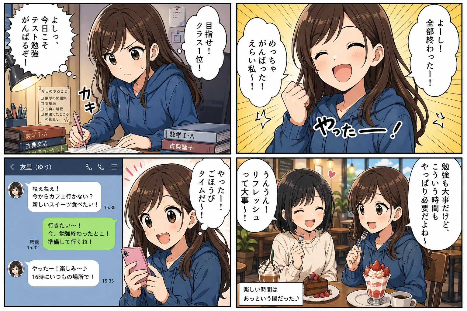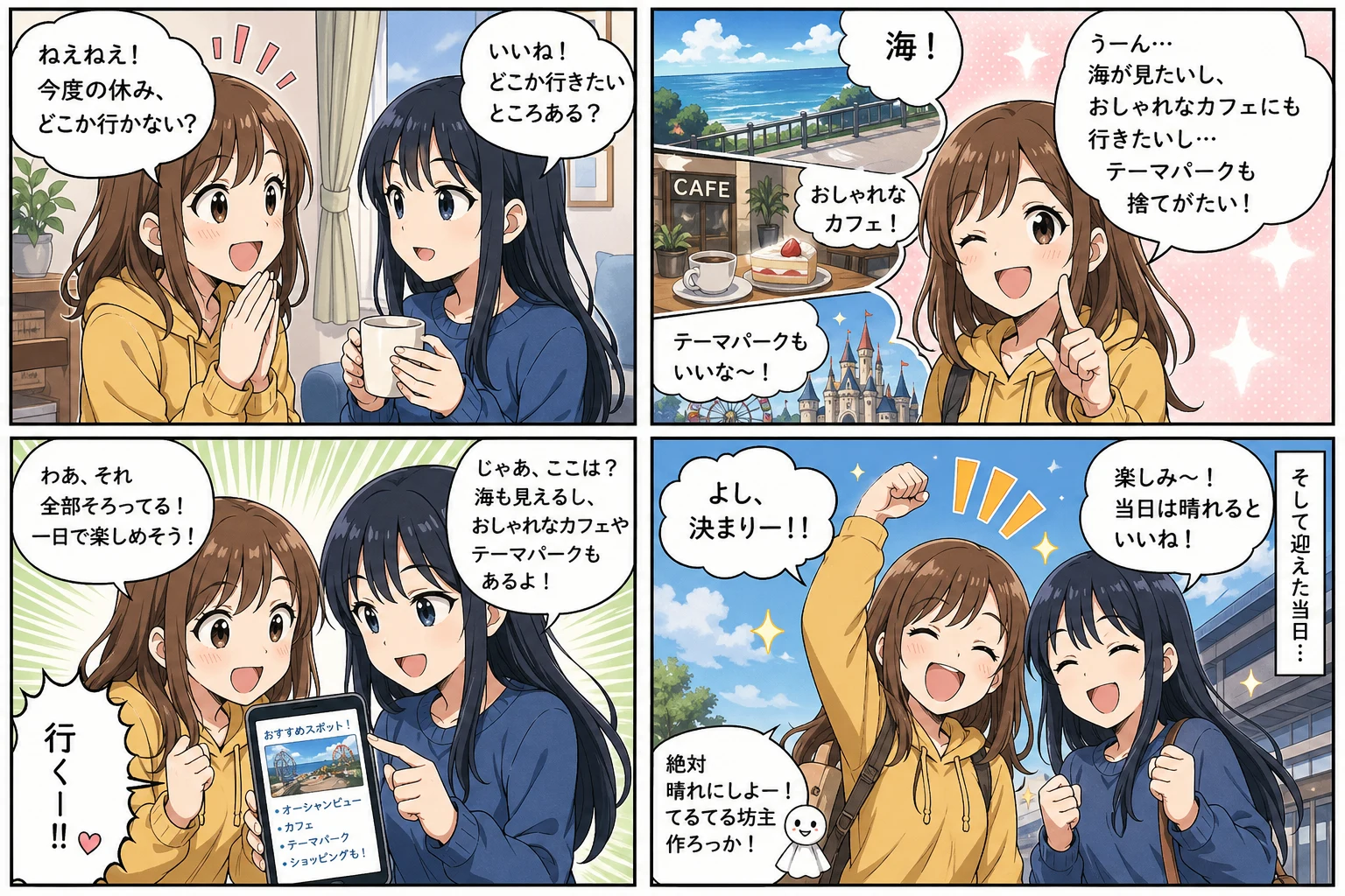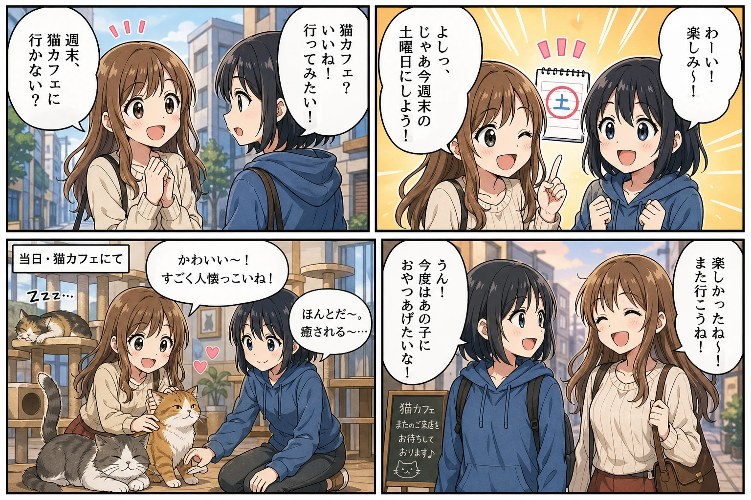 4コママンガメーカー、ヨンコマコミックジェネレーター、日本風コミックストリップAI、写真からマンガパネルへの変換ツールとして使えます。週刊誌のようなテンポ、つまり起承転結のリズムでセットアップ、見せ、リアクション、オチを1枚に収めたい場面に向いたツールです。マンガ風コミックストリップ、スクリーントーン入りのコミック、墨と網のマンガ、カラーのギャグマンガなど、1回の生成で仕上げられます。オフィスのユーモアストリップ、部活ネタのジョーク、ペットのリアクションコミックなど、1枚の絵というより印刷マンガの1ページに近い、シェアしやすい多コマ画像が得られます。